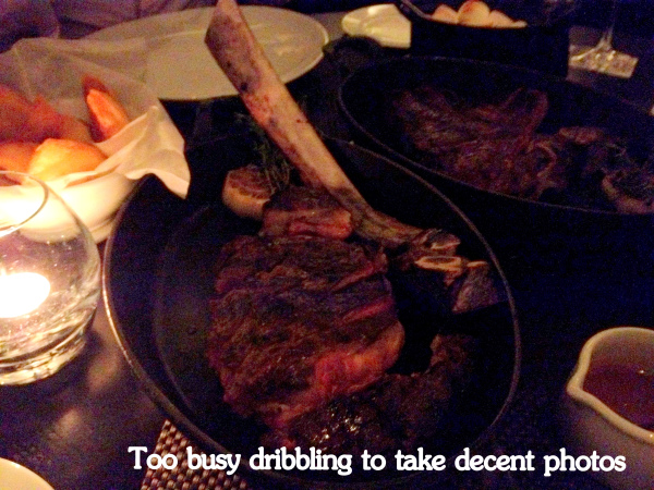 So many choices, what to do! So I turned over to the waiter again. He/we opted for two cuts between three of us; a 900kg Scottish Porterhouse (a T-bone of Filet and Sirloin) and a 1kg USDA Tomahawk. Oh yes, please!