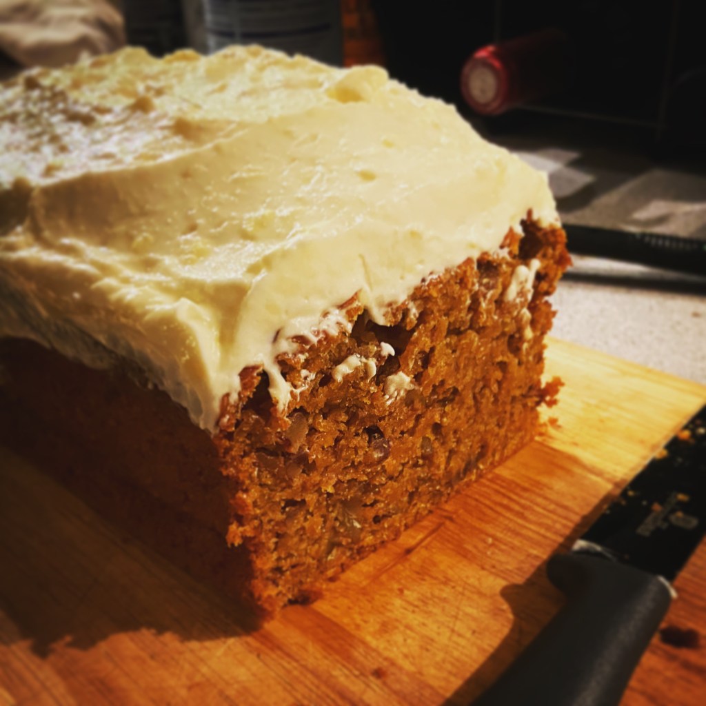 The carrot cake loaf fed us – or is feeding us – well for working-from-home elevenses as well as supper. I am sure my colleague will be as happy as we are, though I am especially sad that I did not win the bet, as I know she would have done better. She is an amazing baker.