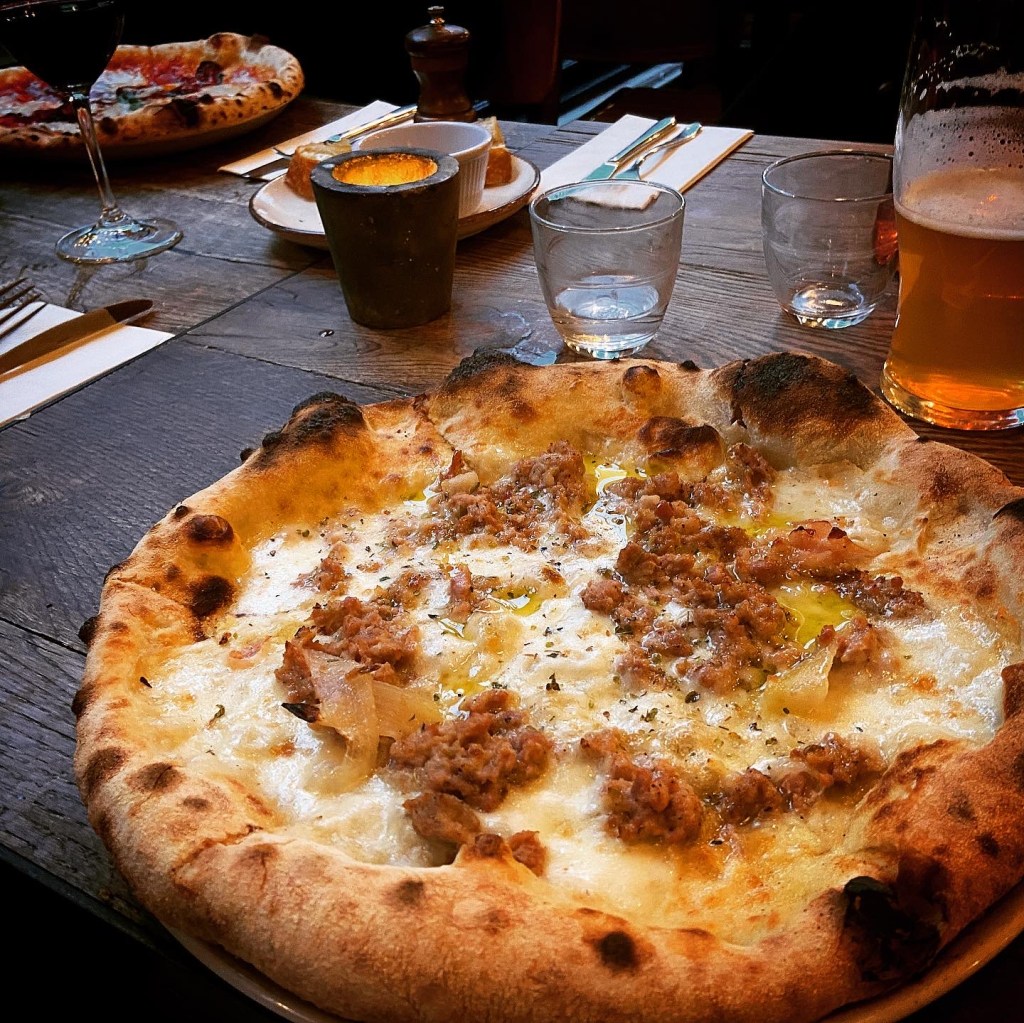 Fare offer a small but tempting selection of tasting-sound main courses and pasta dishes (if you think spaghettone with octopus ragu sounds anything less than sensual, then I don’t want to know you), but ultimately we each chose one of their sourdough pizzas. The starters were generous, and we were getting full (nothing to do with two servings of focaccia of course) but we did our best with the mains. Fare’s pizzas are noble specimens; the ‘Piccante’ was elegantly spiced with ‘nduja and peppery salami, a ‘Tartufo’ was (obviously) very truffle-y and had also been scattered with finely-chopped mushrooms, which is exactly the way mushrooms should be served, period. My white pizza (the exact name escapes me) with sausage was a decadent stodge-fest, and you could tell the sausage was something special. Ultimately, we were beaten. Remnants of the Tartufo and sausage pizzas made for an exciting working-from-home lunch the next day. By the time the pizzas were doggie-bagged, we were biologically similar to leavened dough, so we skipped dessert.