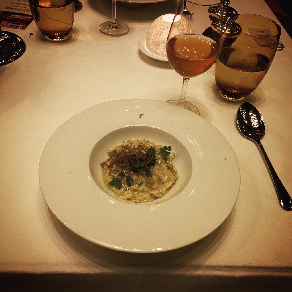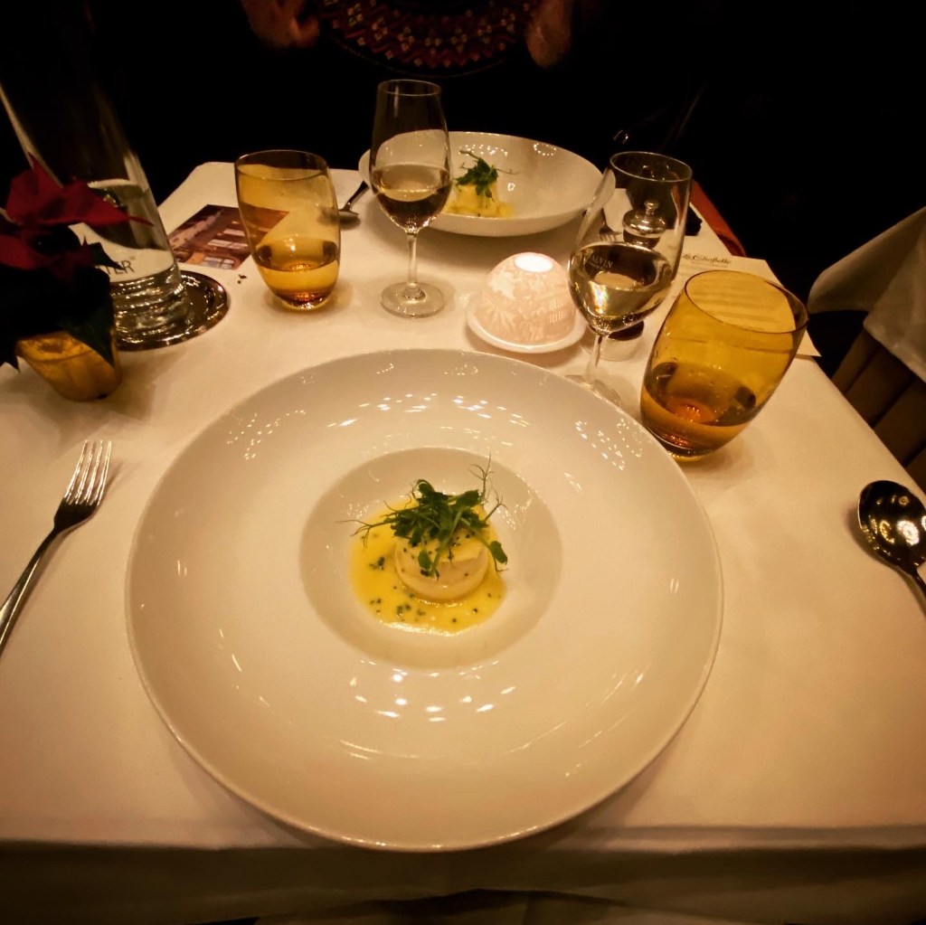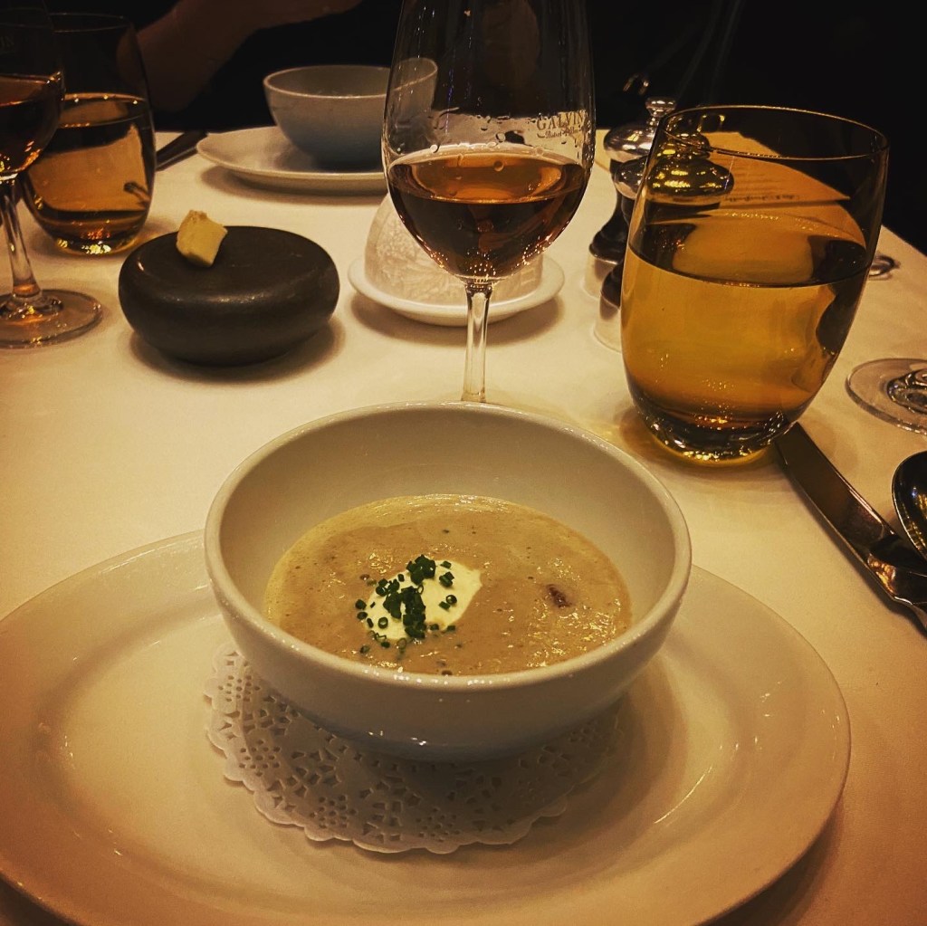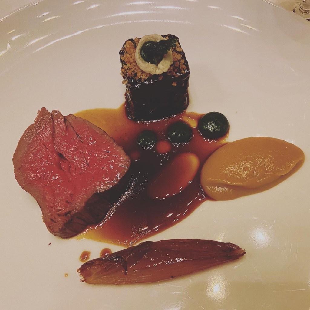 The first impressions and service sometimes ossify these warm and fuzzy anticipatory feelings. Having ordered the wine paring (which was faultless), we were paired with a kooky sommelier who was incredible in his knowledge and aminated, giddy enthusiasm for all things of the vine. His descriptions of the wine were encyclopaedic and entertaining. The choices were brilliantly creative; for example, we received a white Port with the first course, a velouté of Puy lentils, white cheese, and bacon.
