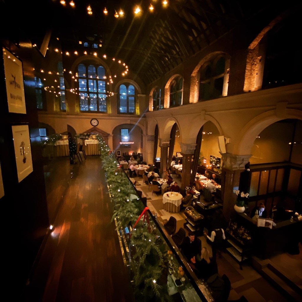 Our beer goggles took in the cavernous, vaulted ceilings and marbled elegance of the restaurant, which once used to be the chapel of a girls’ school just off Bishopsgate. Wine trolleys and P.D.Q. machines nestled between stone columns, and comfy leather seating are arranged along snug cloisters. The toilets – which I visited frequently, thanks to the few too many Beavertowns – are elevated, and the walkway outside offers a stunning panoramic view of this beautiful setting.