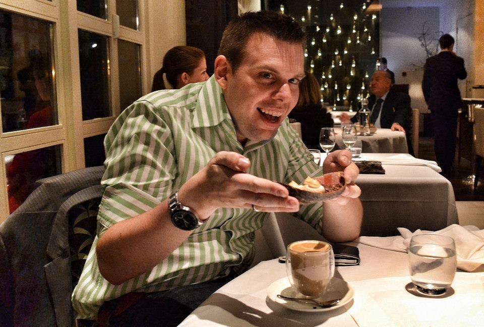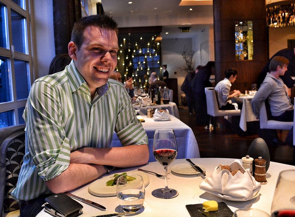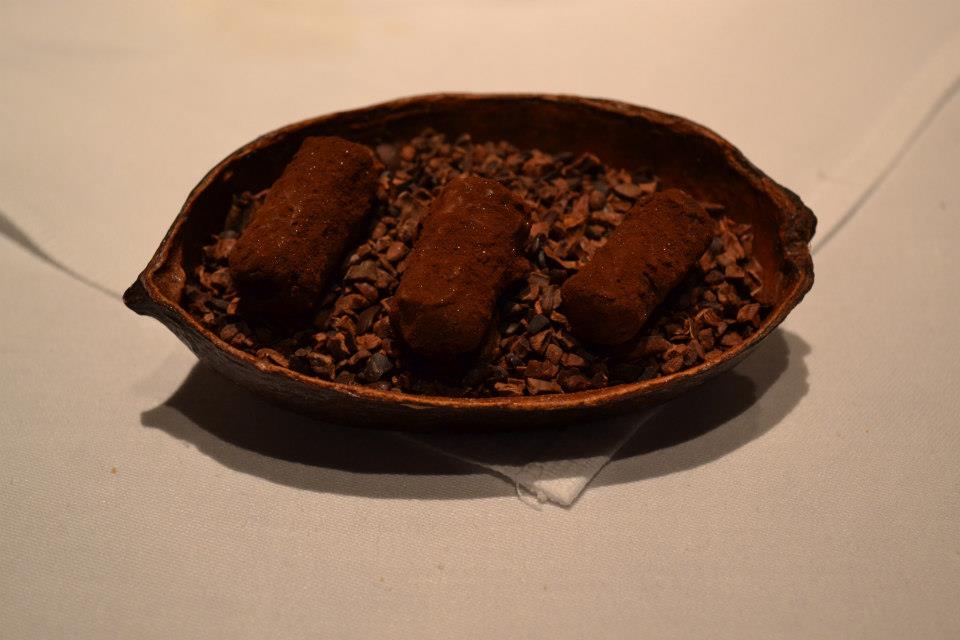 Adam returned a few moments later with the full name of the wine and where to find the stuff in London. This ‘whatever-whenever’ attitude defined the service. The restaurant manager – sadly I did not get his name – led a team of waiters who were there when they were needed but absent when they were not (or when our table erupted into crying fits of laughter, such as when one of us started to eat the cocoa grindings that served as the plate for the petits fours).