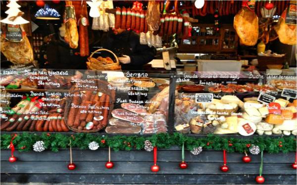 The driving cold (it was always around minus three to five degrees Celsius around town) and the delicious smells had long since given me the rumblies; lunch was taken in the markets, courtesy of a wonderfully rich and oily Hungarian sausage and a pile of spuds sautéed in goose grease. It tasted shamazing – particularly when washed down with the Hungarian drink of choice, red wine – and left me feeling not only replete, but with a cushy new beer coat and slightly pissed for good measure (still carrying a mug of mulled wine past the shops along Váci utca).