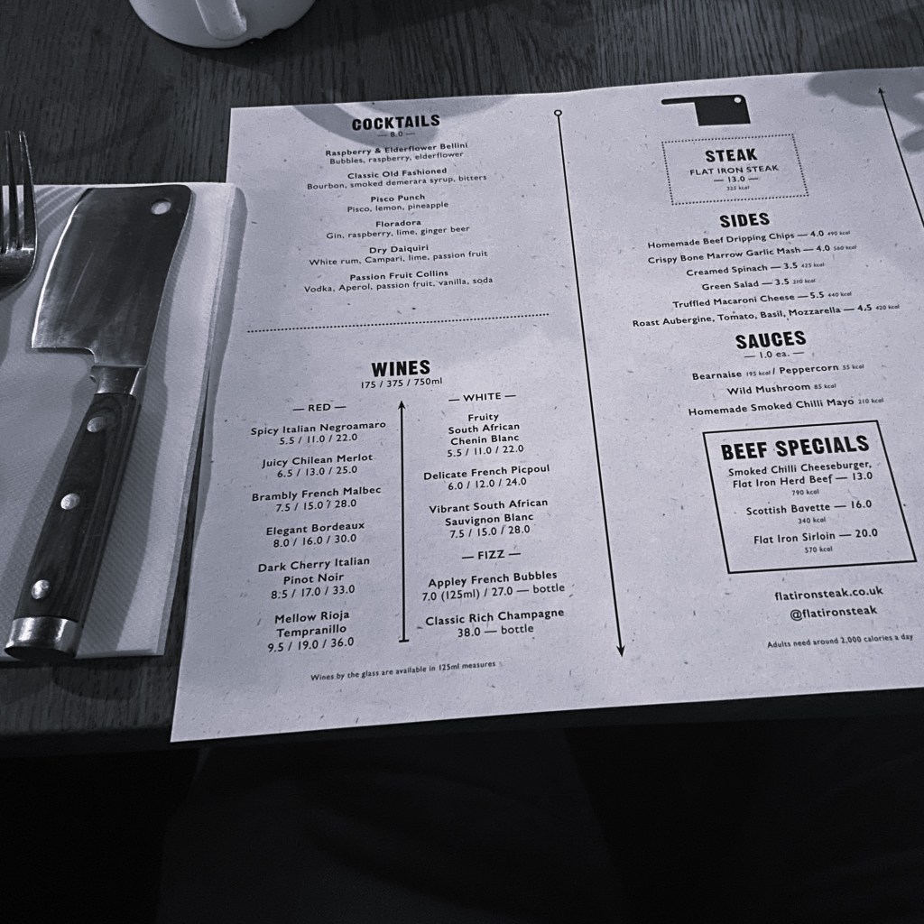 Flat Iron celebrates beef through offering literally sod all else. We went as a team, and I am pretty sure that whereas there were certainly no vegetarians or vegans amongst us, some people were frantically looking anything else to eat but cow, flipping the menu over more than once, in case there was a side of paper that offered, I don’t know, a Caesar salad. The restaurant offers their signature flat iron steak at a reasonable £thirteen, or a Scottish bavette, or a burger. There are meat-free sides, but what are you going to do, order three portions of spinach to get you through to home time?