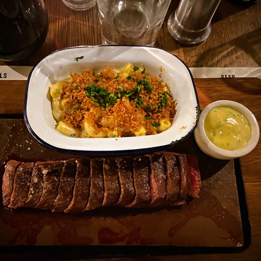 In lieu of starters (there are none to choose from) and not needing to save room for pudding (vanilla soft serve or nothing at all), the ten of us ordered ten flat irons and many sides. The food came out weirdly quickly, but I guess that for a restaurant that serves nothing else and is busy to the point of ‘queue outside and pray’, they’re probably grilling steaks to the vibe, not to the order. Sides come in at around £three to £six and a sauce is £one, so the whole flat iron event swift to the point of “How does the menu fill a whole side of A4?”, but also cheap.