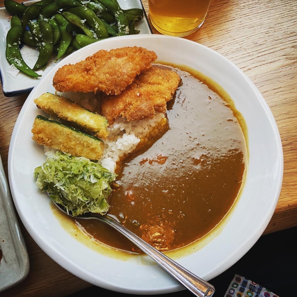 We order shiitake and bamboo shoot gyoza and edamame to start. The gyoza were palatable for her, I said she could keep them. The edamames were fine, but who can stuff these up? For mains she had the Geki Kara, a ramen with Dingly Dell pork belly, and Scotch Bonnet Mash. And I, well I was a happy as a peach because Tonkotsu offer a chicken katsu curry.