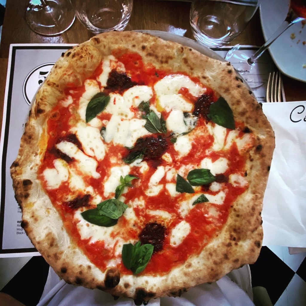 During my regular bedtime doomscrolling, I happened across a provocative post. The post – I can’t remember where it originated from – claimed that Europe’s third best pizza can be found in London. A bold claim, but since substantiated on 50 Top Pizza’s website. Fresh off the back of a near-perfect Margherita at Jacuzzi and the wondrousness of L’Antica Pizzeria da Michele still emblazoned in our minds, we headed off to see what the hype was about.