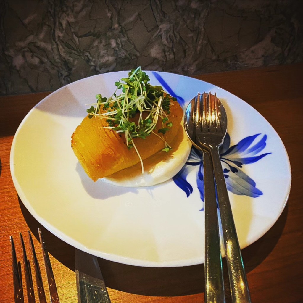 We both ordered the same for our mains, the signature dish of ‘Sweden vs Japan’ (but of course). This is a mouth-wateringly soft brisket, topped with Japanese Wagyu. It’s served with lemongrass jus and sweet Japanese mustard. The combinations are divine, and the whole dish is rich to the point of it outwardly threatening you to clear the plate. The mustard sauce was a double-edged sauce sword; whilst it’s sublime, it packs a punch through its deft balance of mustard and sweetness. It’s incredible; I found myself finding relief fin the slightly less rich jus. Our sides of deep-fried Hasselback potato were worthy companions. Served with whipped brown butter and cream cheese, it might be the best accompaniment to a steak… ever. In fact, this was one of the best steak dinners I have had… ever. We had some greens too. They were nice but faded into the background.