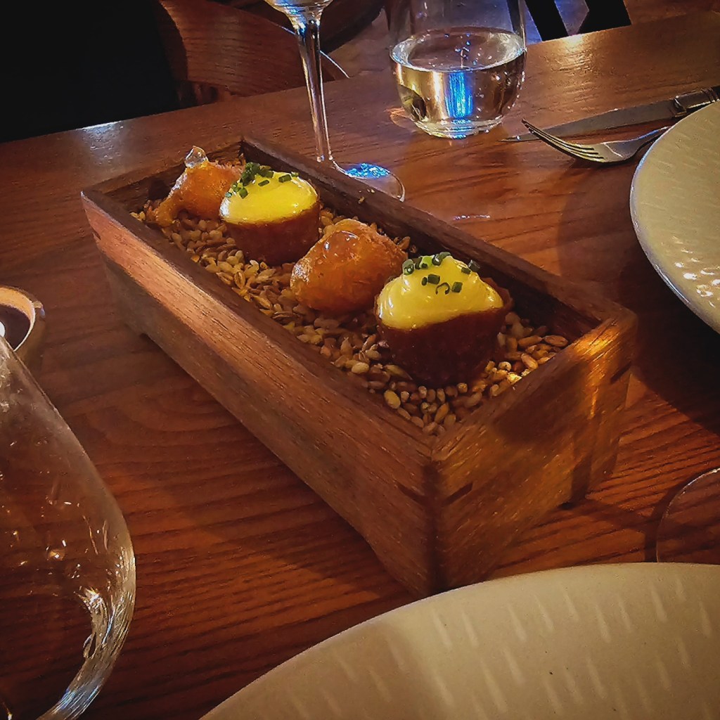 The Fordwich Arms celebrates British food and drink. We kicked off the tasting menu and wine pairing with two glasses of an English sparkling rosé from the Rathfinny Estate in Sussex. The pangs of hunger meant the bubbles went straight to our heads. The amuse bouche saved us, taking the edge off our ravenousness, as well as settling our nerves about what kind of food we would be eating tonight.