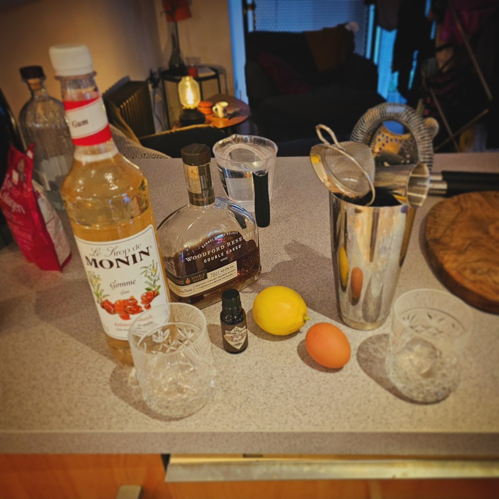 So, what did we drink this evening? Well, it was a long-time favourite of The European’s and a new(ish) favourite of mine, the Whiskey Sour. Dating back to the 1870s, and perhaps derived from the equally fantastic Pisco Sour, this is a sweet and sour aperitif that sounds simple, but is actually intricately layered and complex, and therefore easy to fuck up. I’ve suffered my fair share of dodgy ones, most recently in Cancún, where it was served to my crying face as a tumbler of whiskey, orange juice, and a dash of lemon. But when it’s done right…