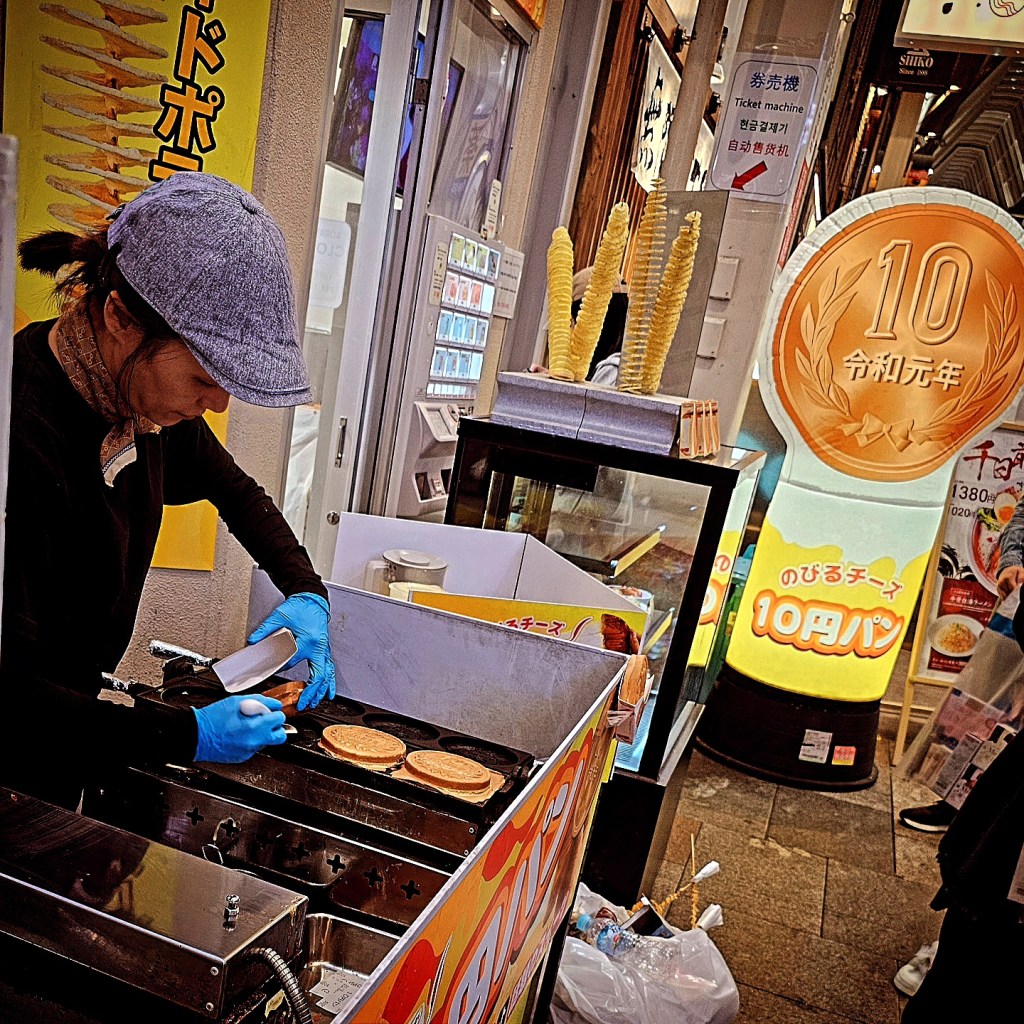 Back to Dōtonbori, after we left Mizuno. We searched for the fabled sweet pancake shaped like a ten-Yen coin and stuffed with cheap mozzarella. Another Insta-famous dish (apparently most food in Japan is), so being the unimaginative kids at heart that we are, we had to try it. It was late, and the food truck where we found them was closing, but we got the last couple that had been freshly prepared, the sugary batter being poured into the moulds, rotated over fire and pumped full of cheese. Tastier than expected, the batter was crunchy on the outside and soft on the inside, with a distinctly – but not overbearingly – sweet taste. The stringy mozzarella oozed out and hung from our mouths as we ate them. I could have had a load more Yencakes that evening, but with three courses of pancakes in one day behind us and a tummy crying for help, we decided to retire for the evening, via the Gashapon machines of course.