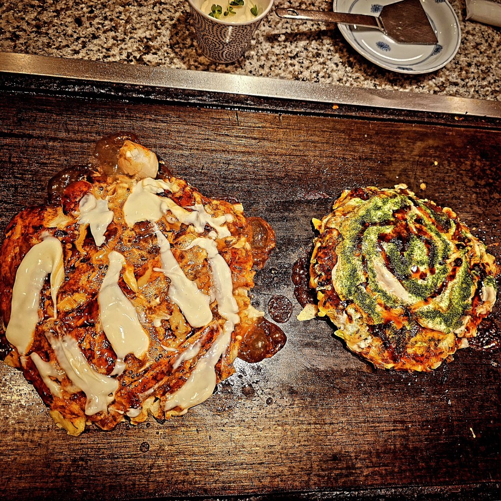 We found our goal, a place called Mizuno, a renowned okonomiyaki restaurant was established in 1945, a couple of hundred metres down the road from Crabzilla. We queued for twenty minutes and were seated upstairs at a table with a built-in grill. We had already ordered a set menu for 3,300 Yen, a showcase of Mizuno’s three bestsellers; Yam Yaki, with pork and scallops, Mitsuno Yaki, with our choice of six ingredients (we chose a mix of chicken and various veggies), and Negi Yaki, with pork and kimchi. These are all mixed together at the table on the grill, the chef-slash-server liberally drizzling the barbeque-soy glaze and mayonnaise over the finished okonomiyaki. The Negi Yaki was served runny and handed over to us; it was great fun to grab the metal spatulas and flip it around until it was ready to eat. Crunchy and packed with umami and multitude of flavours, we enjoyed them all; in fact, it was a surprisingly substantial and complex meal.