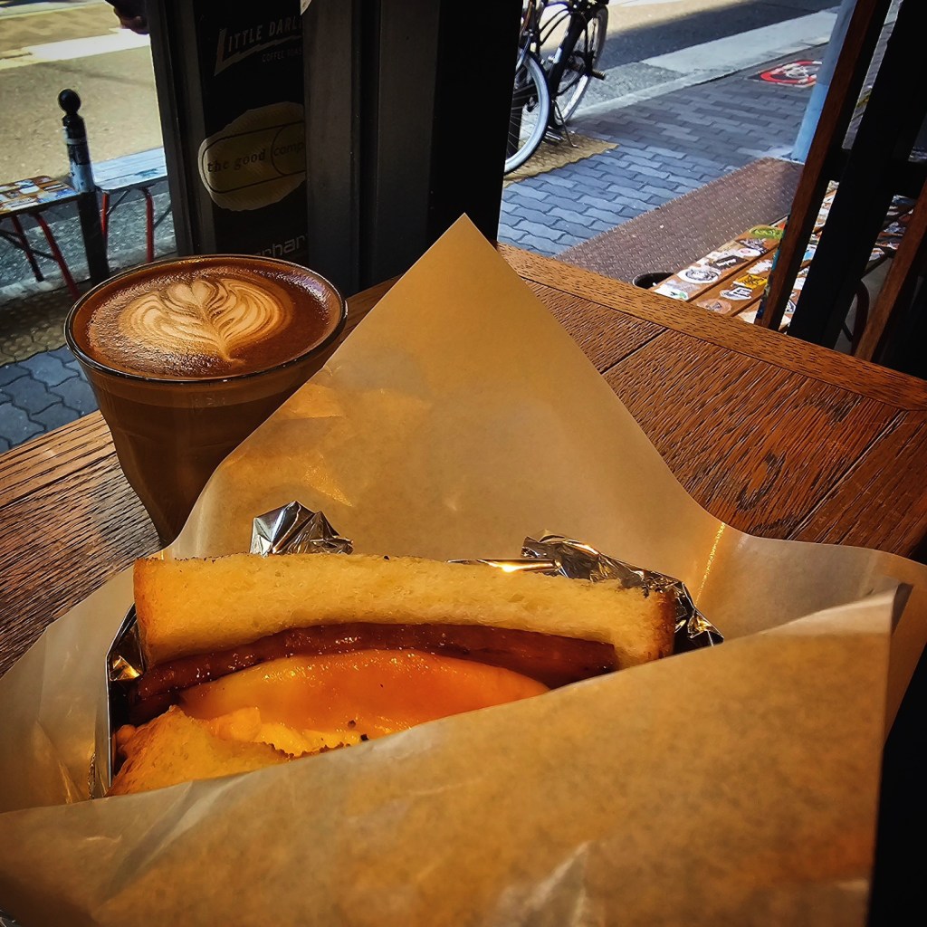 Japan might have burgers and Tesco sandwiches but where the country truly steps into its own are breakfast breads and sandwiches, which are on a different level. One particular stand out example was the ‘Hotsand’, found at Streamer Coffee Company in Osaka, a café only a few steps away from our hotel and Elk, where we enjoyed the fluffy pancakes only a day earlier. Thick white bread was lightly toasted and stuffed to within an inch of its life with bacon and a fluffy omelette, before being wrapped in foil, à la N.Y.C.  We enjoyed them with the best cortados I have had this side of the Prime Meridian and a freshly baked brownie.