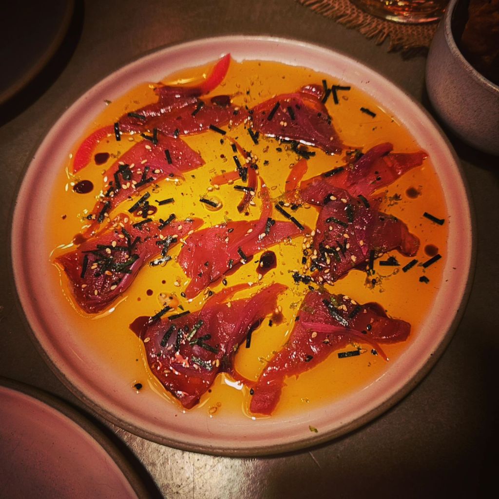 The night was carried along by some incredible service. The team love to chat and tell stories about the food. Each dish is explained methodically, proudly, and with a touch of humour, as you might expect from KOL or other starred restaurants. Water is topped up constantly, more cocktails were ‘maybe suggested’, not upsold, and getting up to use the bathroom was met with a silent nod and a chatty escort to where they’re located.