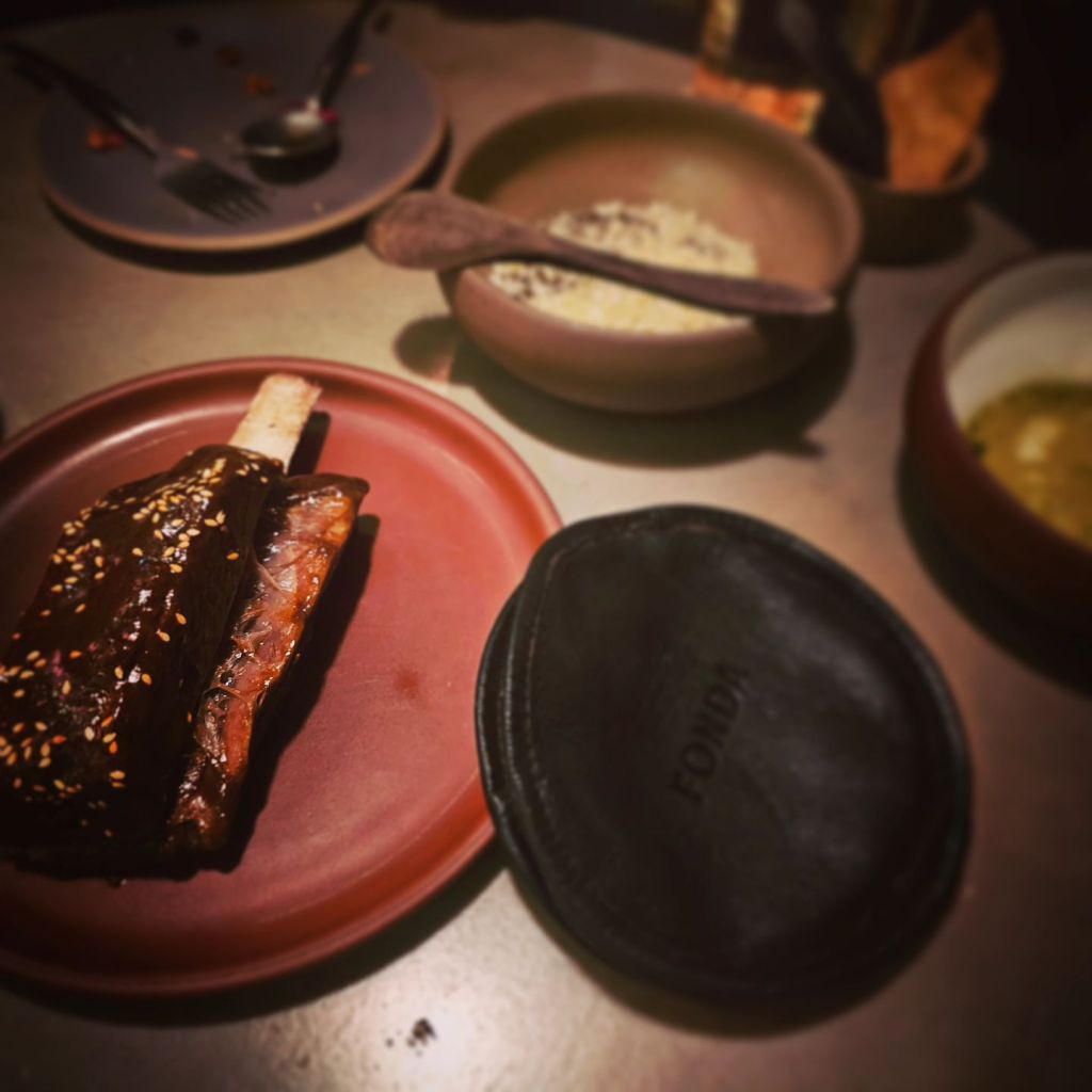 We were less sure about the crab tostadas, busy discs that tasted a little too much of the corn mixed into the shellfish, and, because it was all served cold, felt a little wet and mushy in the mouth. The whole beef short rib, served as a larger plate, was served with mole and tortillas packed into a leather ‘Fonda’ branded pouch. We opted for a side of refried beans and fresh cheese which in hindsight was a poor choice, given a different side option of pickled carrot and red cabbage would have contrasted the earthy and, dare I say, unexceptional flavours.